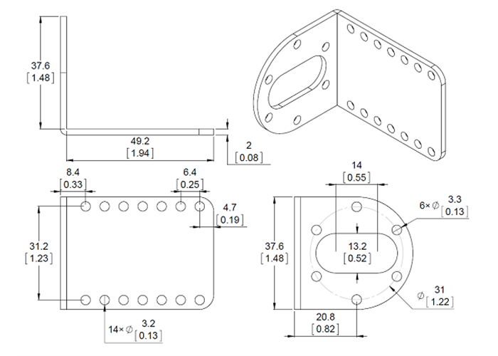 Mechanical drawing for the Pololu stamped aluminium L-bracket for 37D mm metal gearmotors. Units are mm over [inches].