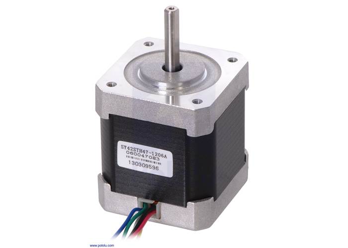 This NEMA 17-size hybrid stepping motor can be used as a unipolar or bipolar stepper motor and has a 1.8° step angle (200 steps/revolution). Each phase draws 1.2 A at 4 V, allowing for a holding torque of 3.2 kg-cm (44 oz-in).