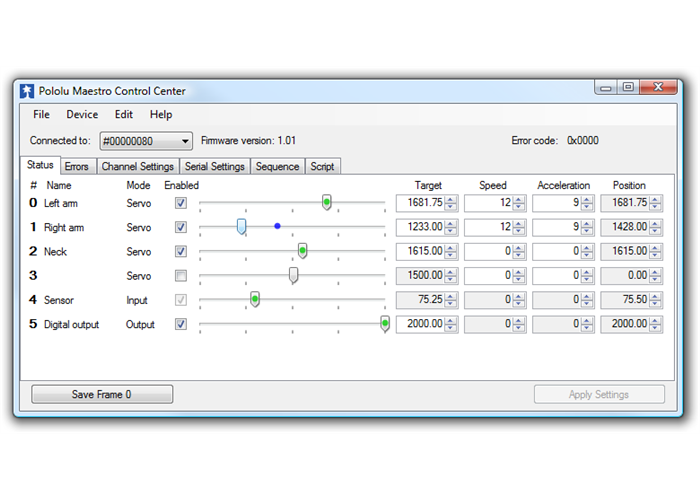 A free configuration and control program is available for Windows and Linux, making it simple to configure and test the device over USB, create sequences of servo movements for animatronics or walking robots, and write, step through, and run scripts stored in the servo controller. The Micro Maestro’s 1 KB of internal script memory allows storage of servo positions that can be automatically played back without any computer or external microcontroller connected.
