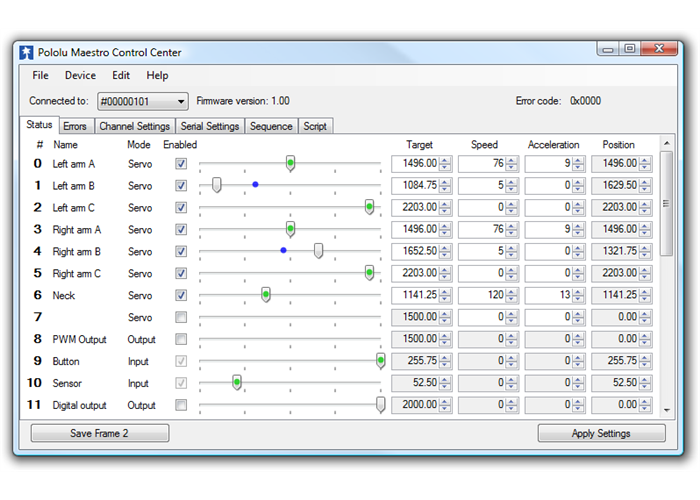 A free configuration and control program is available for Windows and Linux, making it simple to configure and test the device over USB, create sequences of servo movements for animatronics or walking robots, and write, step through, and run scripts stored in the servo controller. The Mini Maestros’ 8 KB of internal script memory allows storage of up to approximately 3000 servo positions that can be automatically played back without any computer or external microcontroller connected.
