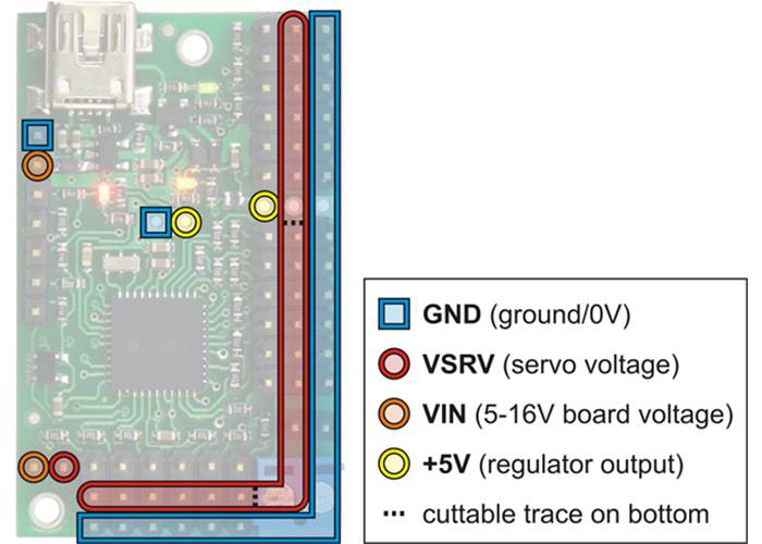 The Micro and Mini Maestros are available with through-hole connectors preinstalled or as partial kits, with the through-hole connectors included but not soldered in. The preassembled versions are appropriate for those who want to be able to use the product without having to solder anything or who are happy with the default connector configuration, while the partial kit versions enable the installation of custom connectors, such as right-angle headers that allow servos to be plugged in from the side rather than the top, or coloured header pins that make it easier to tell which way to plug in the servo cables. The following picture shows an example of a partial-kit version of the 24-channel Mini Maestro assembled with coloured male header pins: