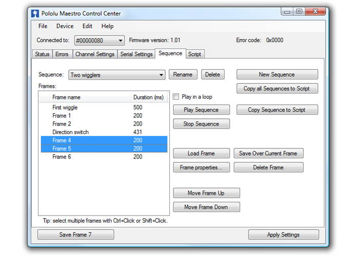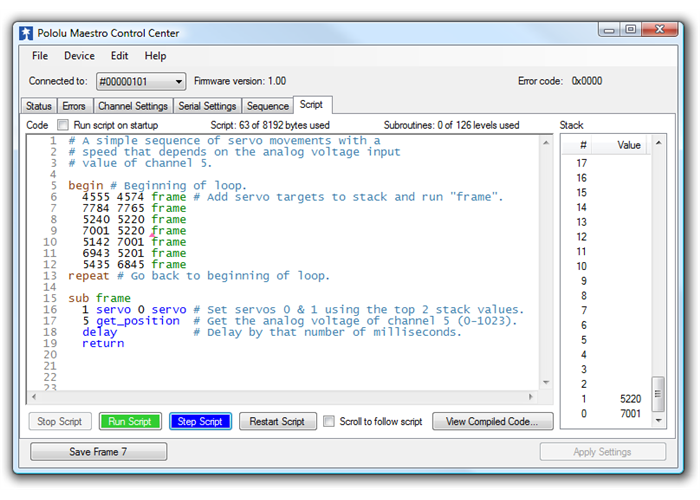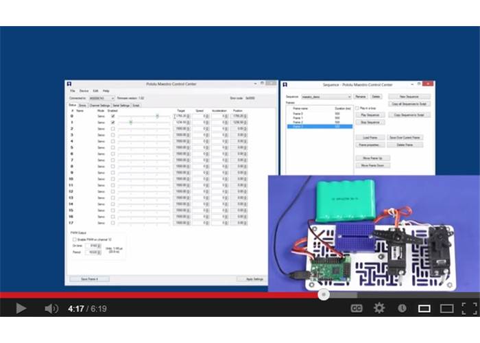 A free configuration and control program is available for Windows and Linux, making it simple to configure and test the device over USB, create sequences of servo movements for animatronics or walking robots, and write, step through, and run scripts stored in the servo controller. The Mini Maestros’ 8 KB of internal script memory allows storage of up to approximately 3000 servo positions that can be automatically played back without any computer or external microcontroller connected.