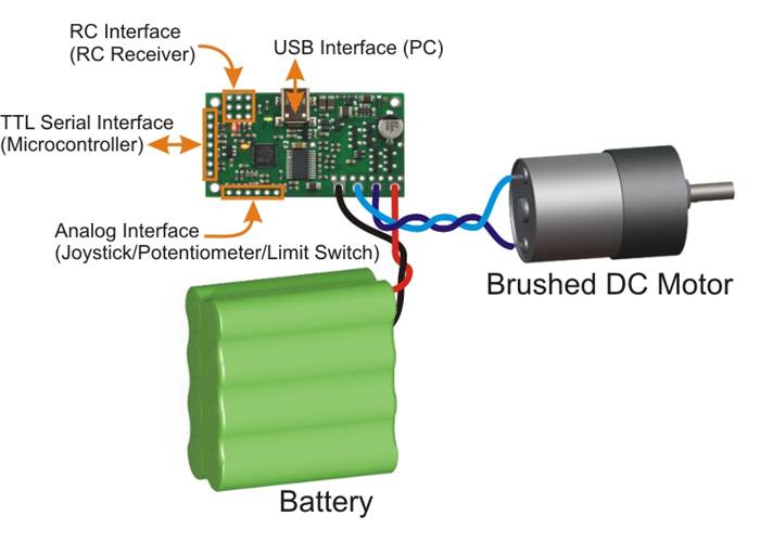 The Pololu Simple High-Power Motor Controller makes basic control of brushed DC motors easy, with our free Simple Motor Control Centre software enabling quick configuration over USB. The controller supports four interface modes: USB, TTL serial, analogue voltage, and hobby radio control (RC).