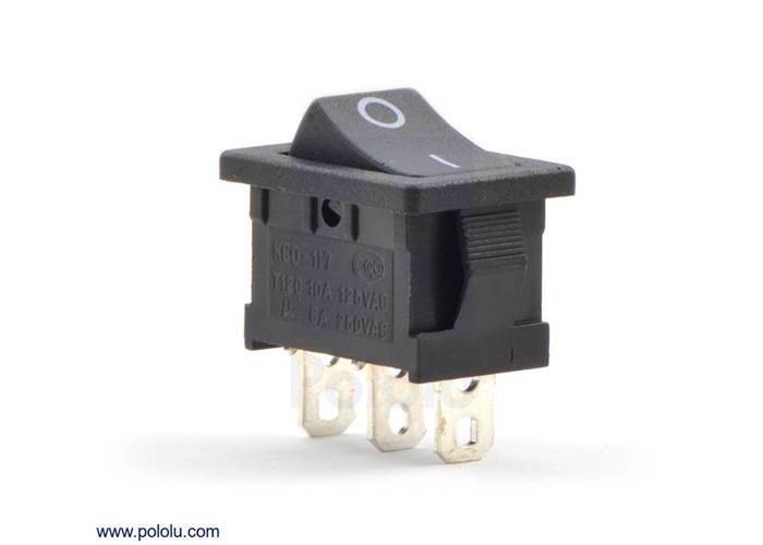 This single-pole, double-throw (SPDT) rocker switch makes a great on/off power switch. It is rated for 10 A at 125 VAC and 6 A at 250 VAC.