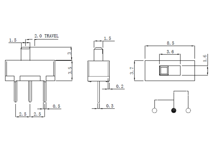 These small single-pole, double-throw (SPDT) slide switches are rated for 300 mA at 50 VDC and make great on/off power switches for low power electronics. They can also be used as a convenient way to choose between two analogue or digital input signals.
