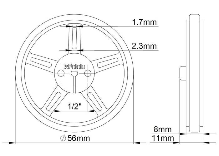 The wheels feature two mounting holes sized for #4 or M3 screws and spaced 12.7 mm (0.5″) apart. This spacing is compatible with several of our universal mounting hubs, which can serve as adapters between these wheels and the shafts on our larger metal gearmotors and stepper motors (see the table at the bottom of this page for information about which wheels are compatible with which universal mounting hubs). The pictures below show these wheels with a universal mounting hub for 4mm shafts installed so it can work with our 20D or 25D metal gearmotors.