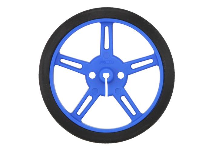 These blue plastic wheels have silicone tires and measure 60 mm (2.36″) in diameter, and they press-fit onto 3mm D shafts, such as those on our micro metal gearmotors .