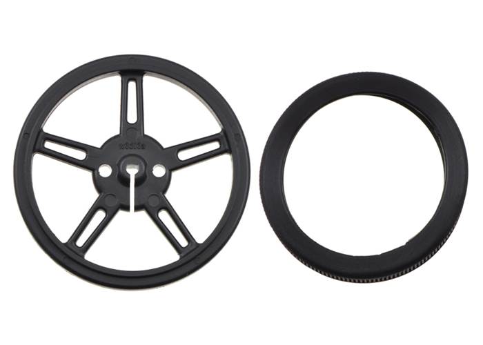 These plastic wheels with silicone tires are 8 mm (0.3″) wide and 60 mm (2.36″) in diameter, and they are designed to press-fit securely onto 3mm-diameter D shafts, such as those on our micro metal gearmotors and our 120:1 mini plastic gearmotor.
