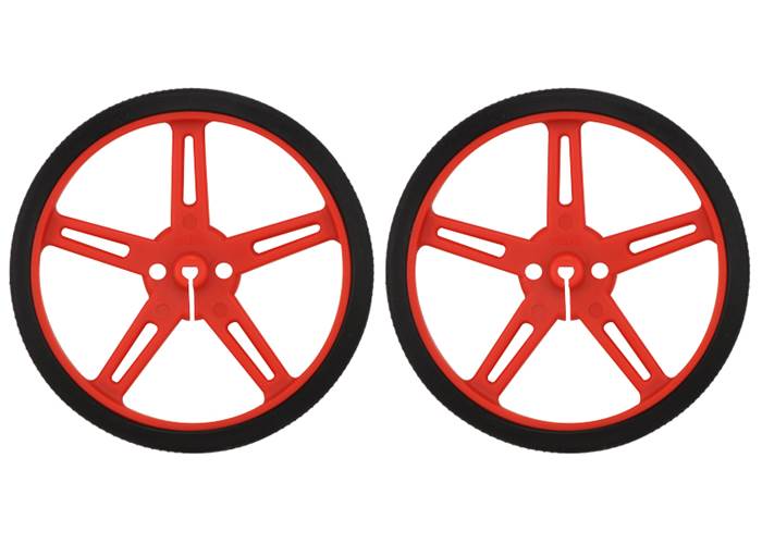 These red plastic wheels have silicone tires and measure 70 mm (2.75″) in diameter, and they press-fit onto 3mm D shafts, such as those on our micro metal gearmotors. Additionally, this wheel is compatible with several of our universal mounting hubs, which can serve as adapters for motors with different shafts. This product is a pair of wheels.