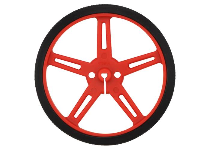 These red plastic wheels have silicone tires and measure 70 mm (2.75″) in diameter, and they press-fit onto 3mm D shafts, such as those on our micro metal gearmotors .