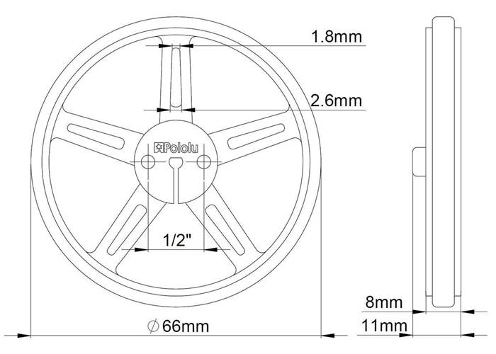 The slots in the five spokes fit #2 or M2 screws and allow additional accessories to be mounted to the wheel such as decorations or parts of an encoder system.