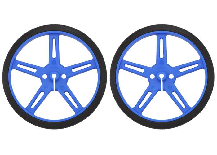 These blue plastic wheels have silicone tires and measure 70 mm (2.75″) in diameter, and they press-fit onto 3mm D shafts, such as those on our micro metal gearmotors. Additionally, this wheel is compatible with several of our universal mounting hubs, which can serve as adapters for motors with different shafts. This product is a pair of wheels.