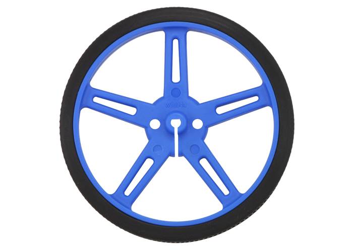 These blue plastic wheels have silicone tires and measure 70 mm (2.75″) in diameter, and they press-fit onto 3mm D shafts, such as those on our micro metal gearmotors .