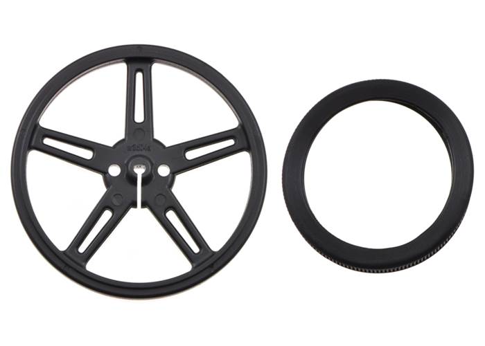 These plastic wheels with silicone tires are 8 mm (0.3″) wide and 70 mm (2.75″) in diameter, and they are designed to press-fit securely onto 3mm-diameter D shafts, such as those on our micro metal gearmotors and our 120:1 mini plastic gearmotor.