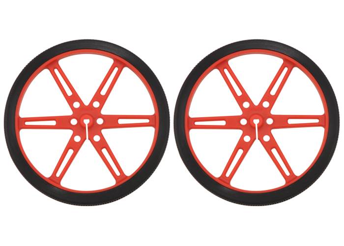 These red plastic wheels have silicone tires and measure 80 mm (3.15″) in diameter, and they press-fit onto 3mm D shafts, such as those on our micro metal gearmotors. Additionally, this wheel is compatible with several of our universal mounting hubs, which can serve as adapters for motors with different shafts. This product is a pair of wheels.