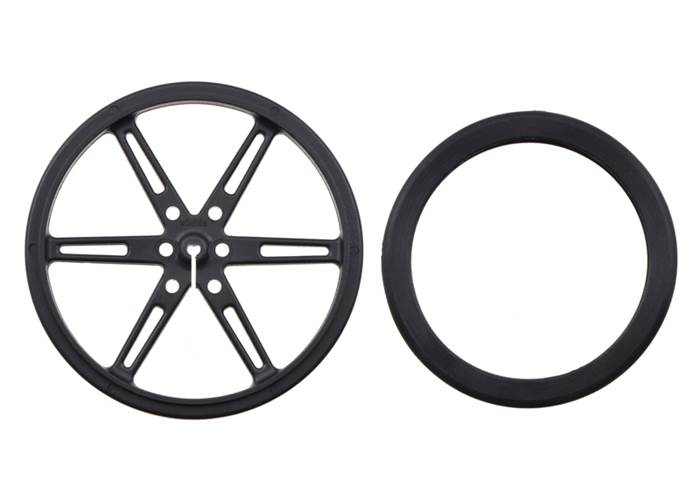 These plastic wheels with silicone tires are 10 mm (0.4″) wide and 80 mm (3.15″) in diameter, and they are designed to press-fit securely onto 3mm-diameter D shafts, such as those on our micro metal gearmotors and our 120:1 mini plastic gearmotor.