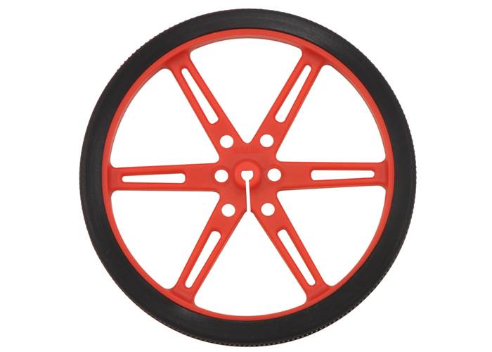 These red plastic wheels have silicone tires and measure 80 mm (3.15″) in diameter, and they press-fit onto 3mm D shafts, such as those on our micro metal gearmotors .