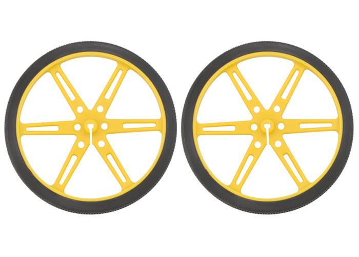 These yellow plastic wheels have silicone tires and measure 80 mm (3.15″) in diameter, and they press-fit onto 3mm D shafts, such as those on our micro metal gearmotors. Additionally, this wheel is compatible with several of our universal mounting hubs, which can serve as adapters for motors with different shafts. This product is a pair of wheels.
