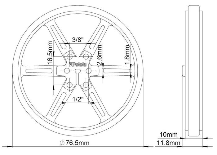 The wheels feature six mounting holes sized for #4 or M3 screws: one pair spaced 12.7 mm (0.5″) apart and two pairs spaced 19.1 mm (0.75″) apart. This spacing is compatible with our universal mounting hubs, which can serve as adapters between these wheels and the shafts on our larger metal gearmotors and stepper motors (see the table at the bottom of this page for information about which wheels are compatible with which universal mounting hubs). The pictures below show these wheels with a universal mounting hub for 6mm shafts installed so it can work with our 37D metal gearmotors.