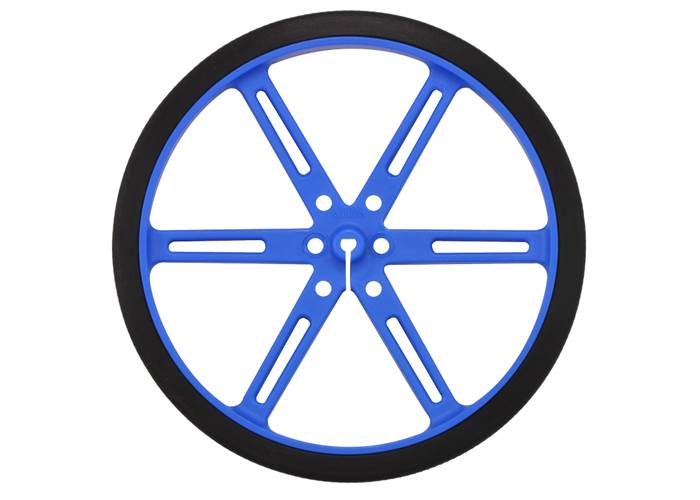 These blue plastic wheels have silicone tires and measure 90 mm (3.54″) in diameter, and they press-fit onto 3mm D shafts, such as those on our micro metal gearmotors. Additionally, this wheel is compatible with several of our universal mounting hubs, which can serve as adapters for motors with different shafts. This product is a pair of wheels.
