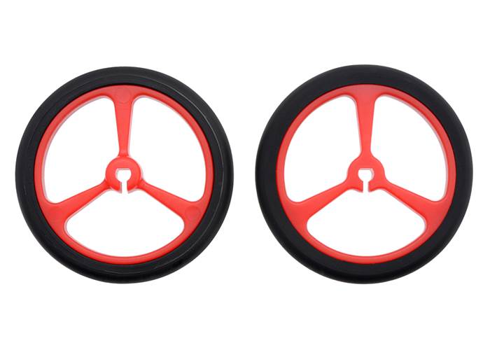 These red plastic wheels have silicone tires and measure 40 mm (1.57″) in diameter, and they press-fit onto 3mm D shafts, such as those on our micro metal gearmotors . This product is a pair of wheels .