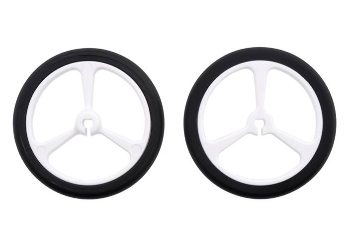 These white plastic wheels have silicone tires and measure 40 mm (1.57″) in diameter, and they press-fit onto 3mm D shafts, such as those on our micro metal gearmotors . This product is a pair of wheels .