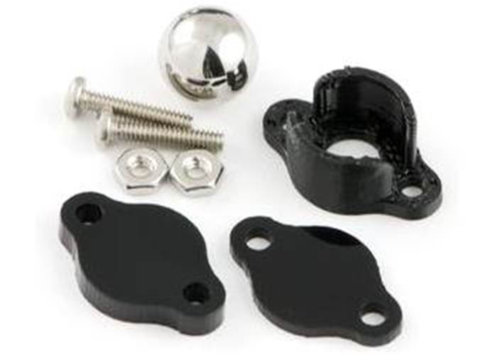 This ball castor kit includes a black ABS housing, a 3/8″ diameter metal ball, two spacers (1/16″ and 1/8″ thick), and two 7/16″ #2 screws and nuts. The total height of the ball castor, 0.4″, can be increased to about 0.6″ using the included spacers. The two included #2 screws can be used to mount the ball castor to your chassis, or you can use your own #2 or M2 screws if your application requires a different length.