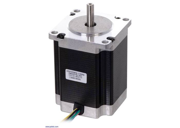 This high-torque hybrid stepping motor has a 1.8° step angle (200 steps/revolution). Each phase draws 1 A at 8.6 V, allowing for a holding torque of 14 kg-cm (190 oz-in). The motor has six colour-coded wires terminated with bare leads that allow it to be controlled by both unipolar and bipolar stepper motor drivers. When used with a unipolar stepper motor driver, all six leads are used. When used with a bipolar stepper motor driver, the centre-tap yellow and white wires can be left disconnected (the red-blue pair gives access to one coil and the black-green pair gives access to the other coil). We recommend using it as a bipolar stepper motor and controlling it with one of our bipolar stepper motor drivers or one of our Tic Stepper Motor Controllers. In particular, the Tics make control easy because they support six different interfaces (USB, TTL serial, I²C, RC, analogue voltages, and quadrature encoder) and are configurable over USB with our free configuration utility.