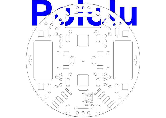 This chassis base plate is a round piece of 1/8" (3 mm) acrylic with a 5" (127 mm) diameter and cutouts for building a differential-drive robot chassis based on our micro metal gearmotors and 42×19mm wheels. The chassis has assorted general-purpose holes and slots that support many configurations of sensors and other robot components.