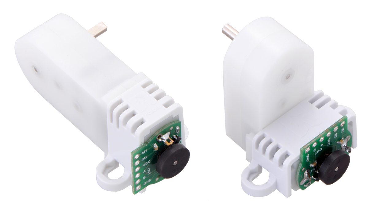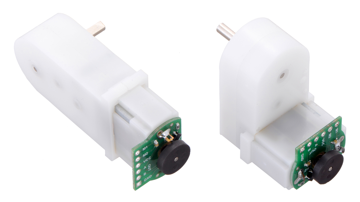 Some versions of these gearmotors are also available with an additional 1.5 mm-diameter output shaft that protrudes from the rear of the motor. This 5 mm-long rear shaft rotates at the same speed as the input to the gearbox and offers a way to add an encoder, such as our magnetic encoder for mini plastic gearmotors, to provide motor speed or position feedback: