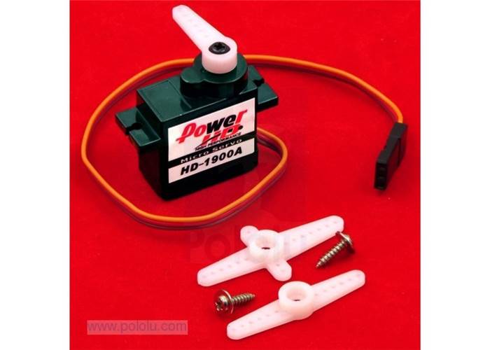 The HD-1900A analog servo from Power HD is a great general-purpose micro servo motor at a great price. Though not shown in the picture, servo horns and associated hardware are included. Key specs at 6 V: 0.08 sec/60°, 21 oz-in (1.5 kg-cm), 9.0 g.