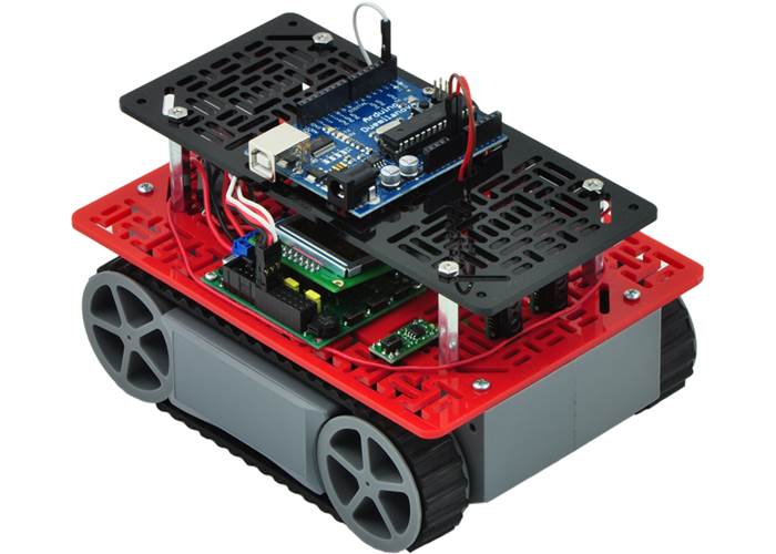 This expansion plate for the Rover 5 tracked chassis is made of 1/8" (3mm) acrylic. The numerous 3 mm wide slots give you the flexibility to mount components in a variety of orientations almost anywhere on the plate.
