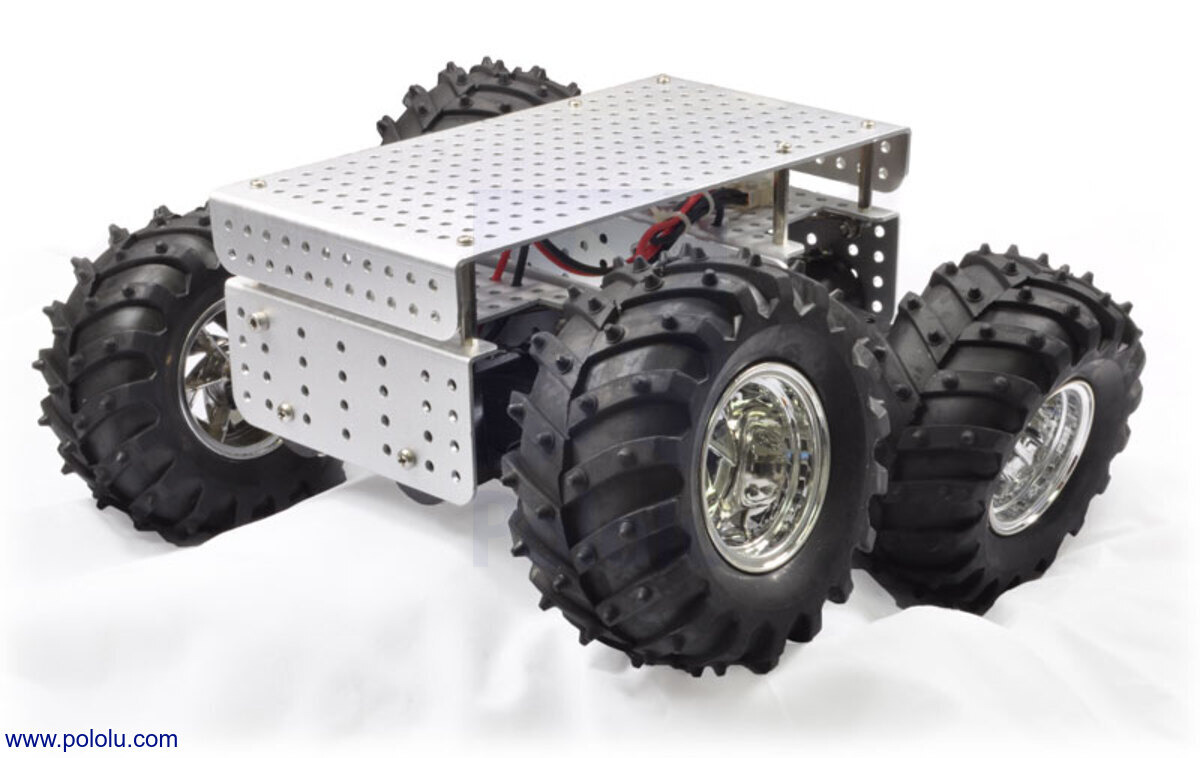 This is a differential-drive chassis, meaning that turning is accomplished by driving the motors on the two sides of the platform at different speeds. The two motors on each side of the robot are wired in parallel, so only two channels of motor control are required to get this chassis moving. The motors are intended for a maximum nominal operating voltage of 7.2 V (2 V minimum), and each has a stall current of 6.6 A and a no-load current of 420 mA at 7.2 V. Since the motors will briefly draw the full stall current when abruptly starting from rest (and nearly twice the stall current when abruptly going from full speed in one direction to full speed in the other), we recommend a motor driver capable of supplying the 14 A combined per-channel stall current of these motors at 7.2 V. We offer several motor controllers and drivers that meet these power requirements and make it easy to get this chassis moving: