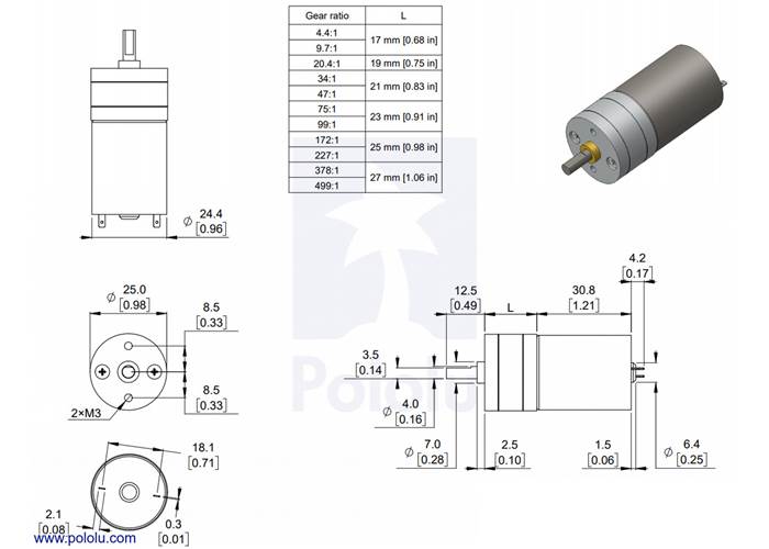 The diagram below shows the dimensions of the 25D mm line of gearmotors (units are mm over [inches]). This diagram is also available as a downloadable PDF (171k pdf).