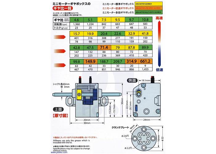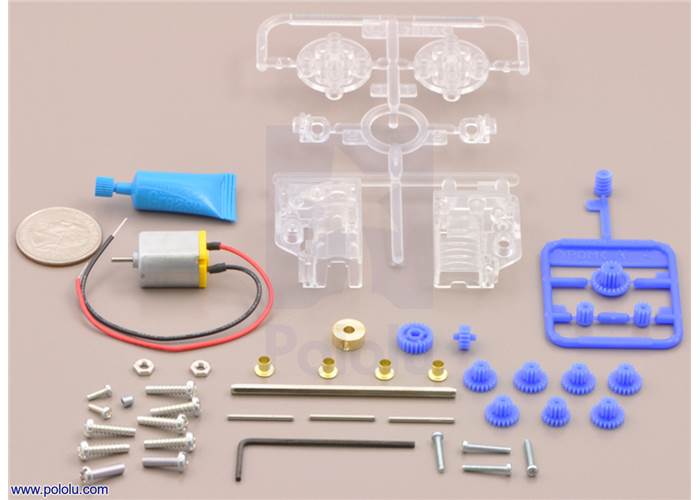 The mini-motor gearbox kit from Tamiya makes it easy to get a small robot or plastic model moving. The kit includes one brushed DC motor and all the gears and parts to build any of the four possible gear ratio configurations: 71.4:1, 149.9:1, 314.9:1, or 661.2:1. The four gear ratio options give you the flexibility to choose the best speed and torque for your project.