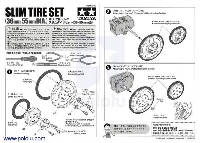 The Tamiya slim tire set contains two wheels with a diameter of 36 mm (1.4") and two wheels with a diameter of 55 mm (2.2"). These have a width of 3.5 mm (0.14") and are compatible with all Tamiya gearbox kits.