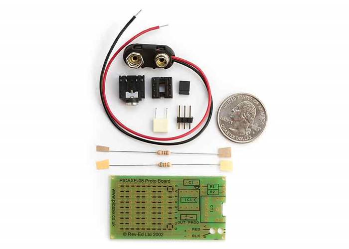 This is a very basic beginner's kit for 8 pin PICAXE microcontrollers or a handy way to quickly hook up a 8 pin for the more experienced user. Includes a handful of easy-to-solder through hole components. Be sure to purchase the 8-pin PICAXE below.
