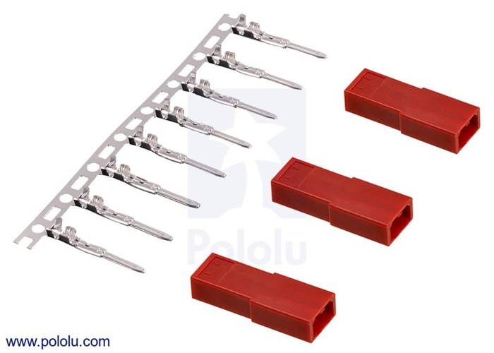 This pack contains enough housings and crimp pins (including two spare pins) for three male connectors (we also offer a pack for the female version). The crimp pins are designed for 22- to 28-AWG wires, and we sell a crimping tool that works well with them. As an alternative, we sell a pre-crimped version of this connector with 10 cm leads.
