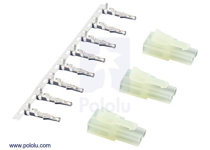 This connector is keyed so that power cannot be reversed, and a latch secures the connection so that it will not become disconnected. This pack contains enough housings and crimp pins (including two spare pins) for three female connectors (we also offer a pack for the male version). The crimp pins are designed for 16- to 20-AWG wires, and we sell a crimping tool that works well with them. As an alternative, we sell a pre-crimped version of this connector with 10 cm leads.