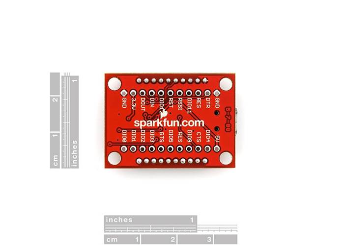 The highlight of this board is an FT231X USB-to-Serial converter. That’s what translates data between your computer and the XBee. There’s also a reset button, and a voltage regulator to supply the XBee with plenty of power. In addition, there are four LEDs that’ll help if you ever need to debug your XBee: RX, TX, RSSI (signal-strength indicator), and power indicator.