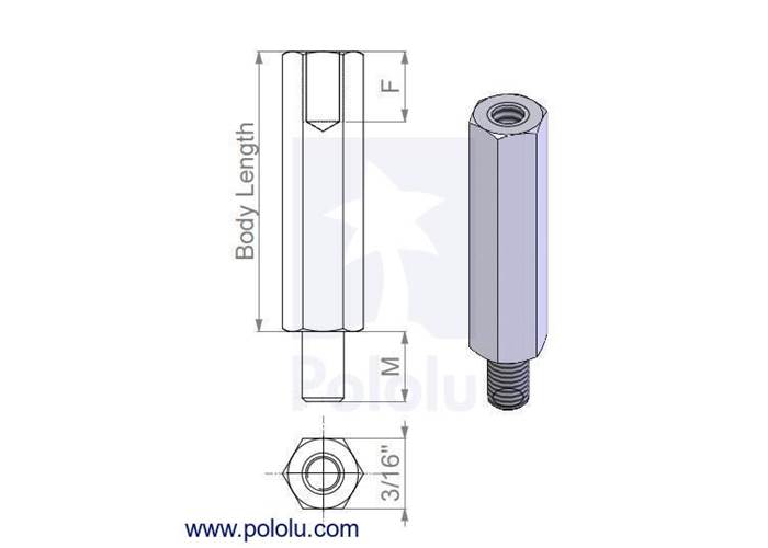 These M-F (male-female) aluminium standoffs are great for separating stacked components or chassis tiers. Each hexagonal standoff is 3/16″ wide with male threading extending 3/16″ to 1/4″ from one end (dimension M on the mechanical drawing to the right) and female threading to a depth of 3/16″ to 1/4″ in the other end (dimension F). A variety of lengths and thread types are available: