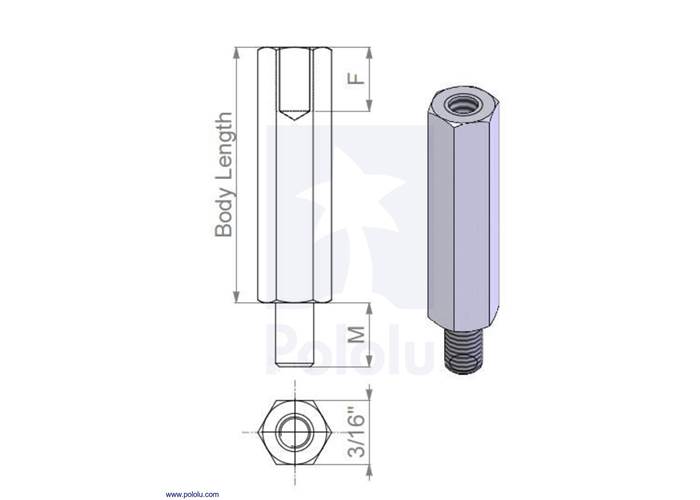 These M-F (male-female) aluminium standoffs are great for separating stacked components or chassis tiers. Each hexagonal standoff is 3/16″ wide with male threading extending 3/16″ to 1/4″ from one end (dimension M on the mechanical drawing to the right) and female threading to a depth of 3/16″ to 1/4″ in the other end (dimension F). A variety of lengths and thread types are available: