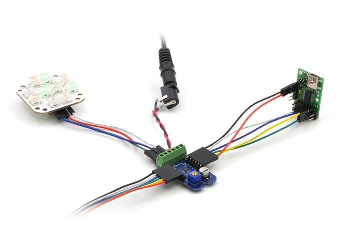 An example setup using a Micro Maestro to control a ShiftBar and Satellite LED Module is shown in the picture below and one of the videos above. Maestro source code to control a ShiftBar or ShiftBrite is available in the Example scripts section of the Maestro User’s guide.
