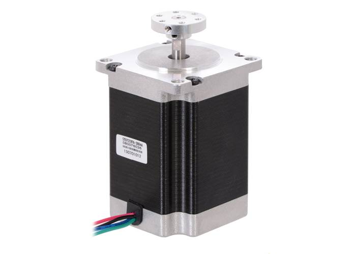 1/4″ Pololu universal aluminum mounting hub on a NEMA 23 stepper motor with 1/4″-diameter output shaft.