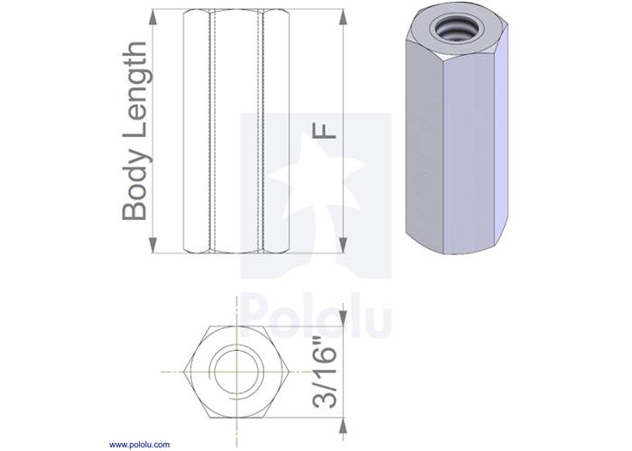 These 3/16" -long hexagonal female-female aluminium standoffs keep parts spaced 0.188 inches (4.8 mm) apart. They are like elongated, 3/16″-wide hex nuts, with 2-56 threads running through the entire length of each standoff. They are sold in packs of 4 .