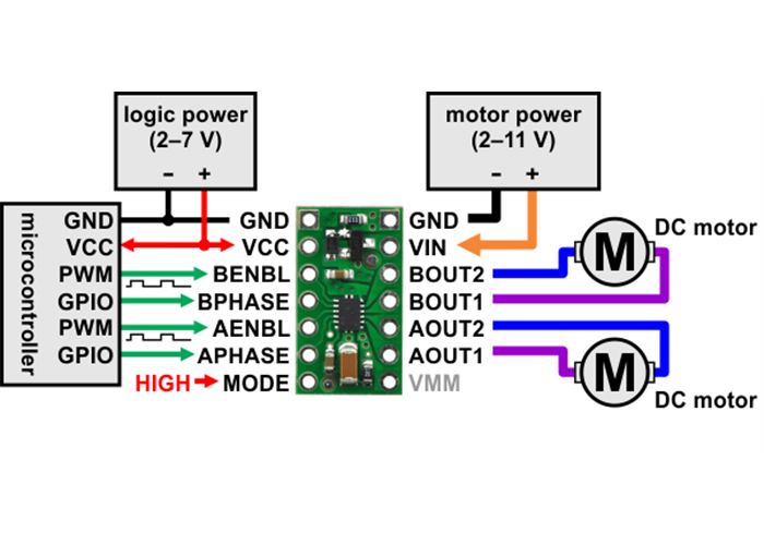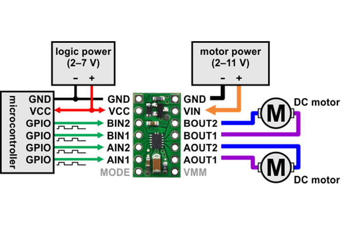 Motor and motor power connections are made on one side of the board and logic power and control connections are made on the other. The driver requires a motor voltage between 0 V and 11 V to be supplied to the VIN or VMM pin and a logic voltage between 1.8 V and 7 V to be supplied to the VCC pin; the logic voltage can typically be supplied by or shared with the controlling device. The VIN pin is the reverse-protected motor supply input and is the recommended point for connecting motor power. However, driver performance will start getting worse when the input voltage to the reverse-protection circuit is below a few volts, and 1.5 V is the lower limit of where the VIN pin can be used. For very low voltage applications, the motor supply should be connected directly to VMM, which bypasses the reverse-protection circuit.