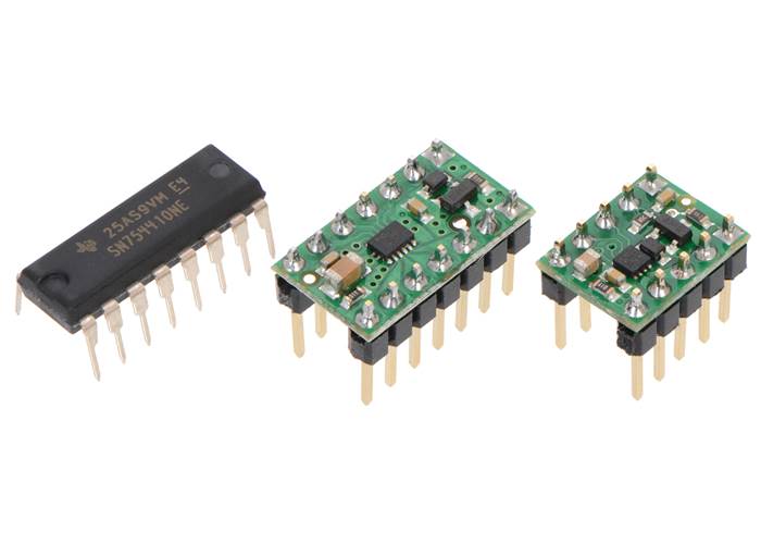 TI SN754410 (16-pin DIP) next to the #2135 DRV8835 carrier (14-pin DIP) and #2990 DRV8838 carrier (10-pin DIP) for size reference.