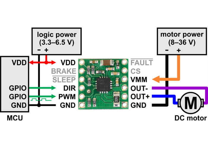 This tiny breakout board for TI’s DRV8801 provides a modern alternative to classic motor drivers such as the L293D, SN754410, and L298N. It can deliver a continuous 1 A (2.8 A peak) to a single motor and offers a wide operating voltage range of 8 V to 36 V.