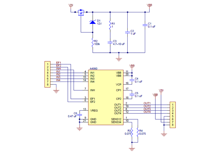 | VBB | This pin gives access to the motor power supply after the reverse-voltage protection MOSFET (see the board schematic below). It can be used to supply reverse-protected power to other components in the system. It is generally intended as an output, but it can also be used to supply board power. | |