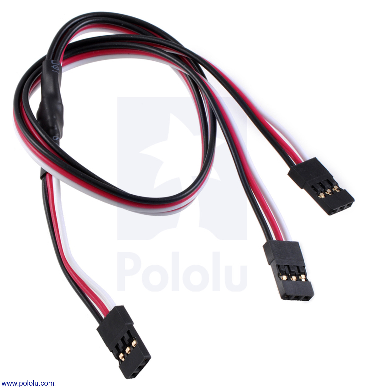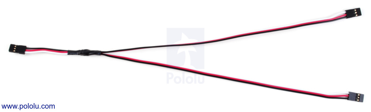 This 12-inch (300-mm), twisted Y-cable can be used to split a single RC hobby servo signal into two identical outputs. It has 22-AWG wires terminated on all three ends by “JR”-style female connectors, which are compatible with 0.1" header bins and both male JR and male Futaba J connectors. The split occurs close to the cable’s input, so the two output ends can be separated by up to approximately 18" (450 mm). The cable’s conductors each consist of 60 strands, making it much more flexible than standard servo cables, and the wires are twisted to reduce electromagnetic interference (EMI).